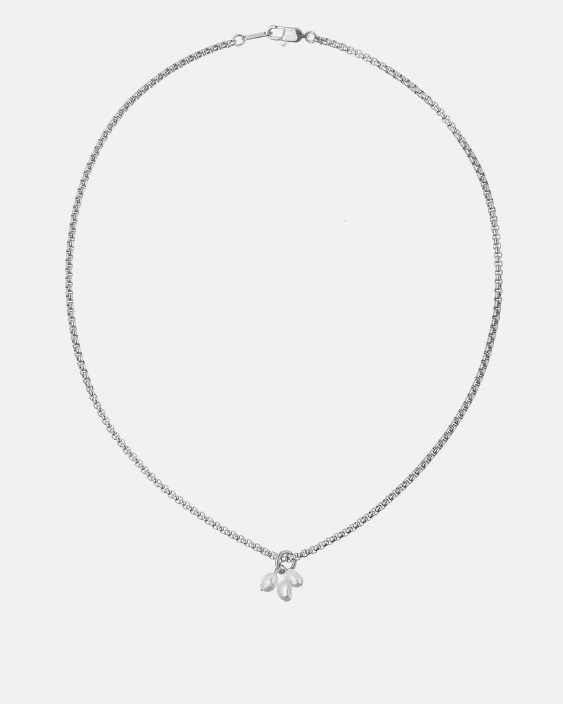 A stainless steel chain with three freshwater pearls. A versatile piece of jewelry that compliments any outfit, whether it's for a special occasion or to elevate your everyday look. Wear it alone or for a bolder look, combine it with other necklaces and pearl bracelets.