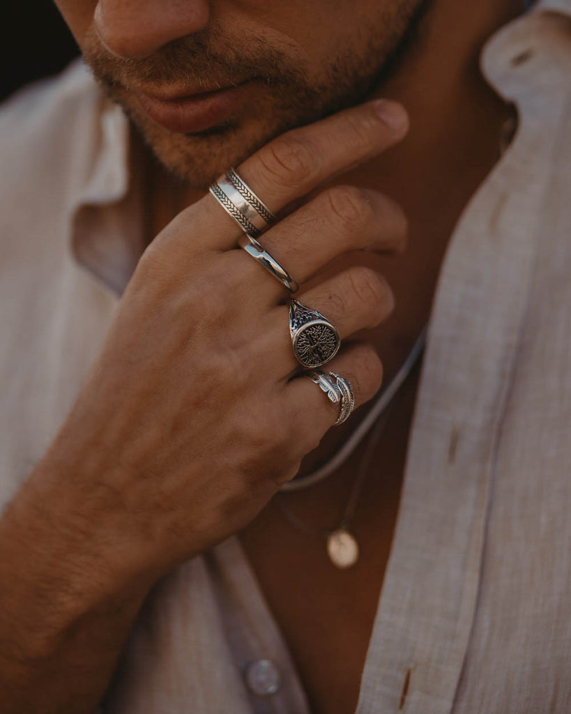 Anillo de plata 925 con gran resistencia al agua. Un accesorio único con un diseño de plumas para dar un toque de ligereza a su estilo. Este anillo, que simboliza el poder y la ligereza, puede llevarse solo o combinado con otros anillos de plata y accesorios para elevar tu estilo. Para una guía completa sobre cómo mantener la calidad de tus joyas de plata, puedes ver la guía de cuidados.