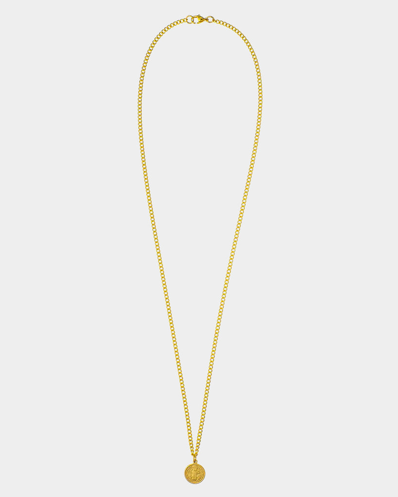 Collar dorado de acero inoxidable 316L con colgante de San Benito. Este collar con colgante rinde homenaje a San Benito, patrón de Europa. Una combinación perfecta de fe y diseño. Pieza detallada con el retrato del santo. Llévelo solo o combínelo con otros accesorios Dicci para crear su propio estilo.