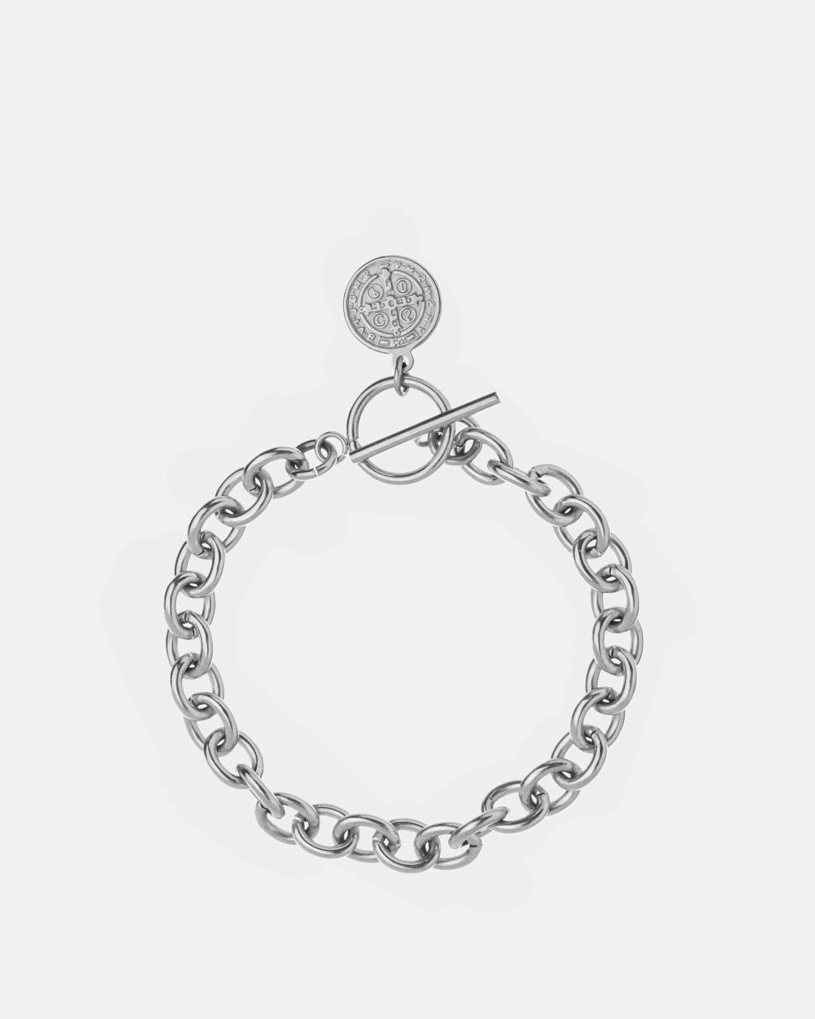Pulsera link 1*1 de acero inoxidable 316L con un colgante de San Benito. Esta pulsera rinde homenaje a San Benito, patrón de Europa. Pieza detallada con el retrato del santo. Llévala sola o combínala con otros accesorios Dicci para crear tu propio estilo. Modelo disponible con otra cadena.
