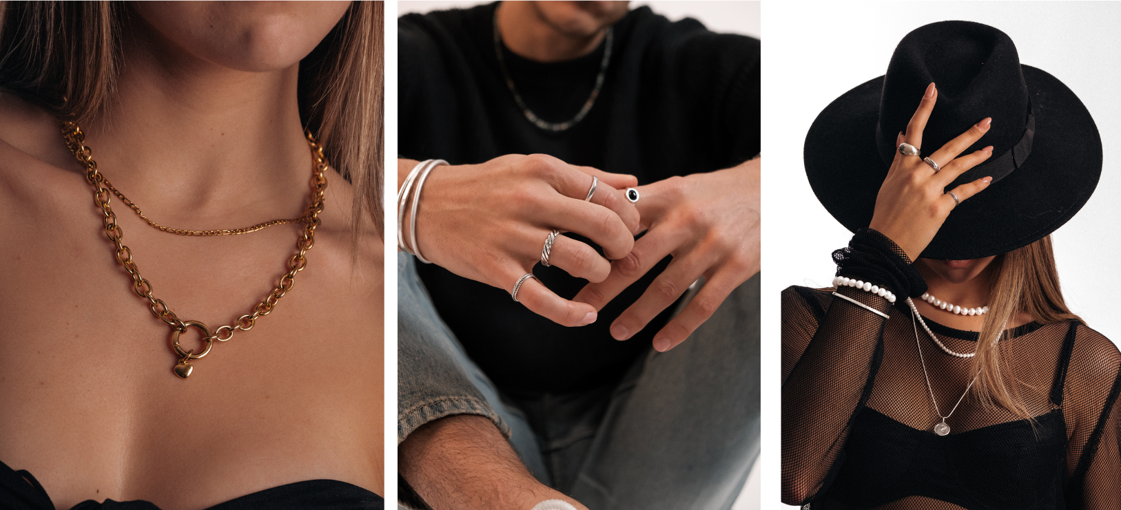 Não há regras no que toca a fazer camadas de colares. Por muito diferente que seja o design, no fim o que interessa é que a mistura de peças se torne num visual coeso e que expresse a identidade de quem o usa.