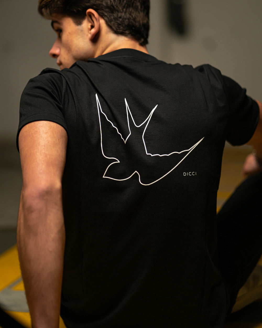 Cor: t-shirt preta com estampado branco de um pássaro voador